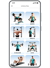 Muscle-focused workout templates with exercise GIF guidance, real-time tracking of sets, reps, calories, and saved workouts for long-term progress tracking.
